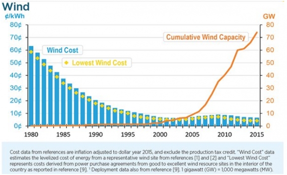 Obecnie farmy wiatrowe wytwarzają już 5% produkowanej w USA elektryczności, a DOE przewiduje, że do 2030 roku udział ten wzrośnie do 20%, a do 2050 roku do 35%. Według prognoz DOE spadek cen kosztu energii z turbin wiatrowych ma trwać dalej, sięgając kolejnych 35% do 2050 roku.