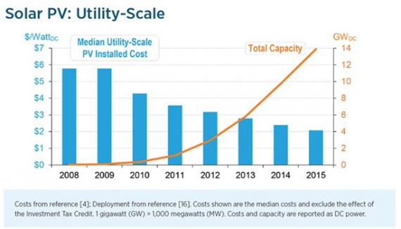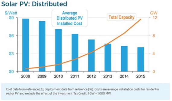 Spadek cen energii z domowej fotowoltaiki od 2008 roku wyniósł 54%, a z dużych farm słonecznych sięgnął aż 64%. DOE szacuje, że do 2020 roku koszt domowych instalacji PV spadnie o kolejne 16-33%.