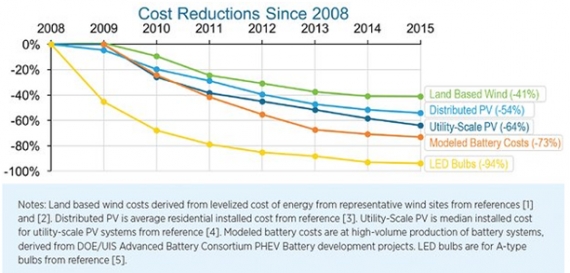 Nowy raport Departamentu Energii USA podsumowuje zmiany cen i trendy w liczbie instalacji kluczowych technologii czystej energii: farm wiatrowych, małych i dużych farm fotowoltaicznych, baterii i lamp LED. Ceny tych technologii w ciągu siedmiu ostatnich lat, od 2008 do 2015 roku spadły od 41 do 94%.