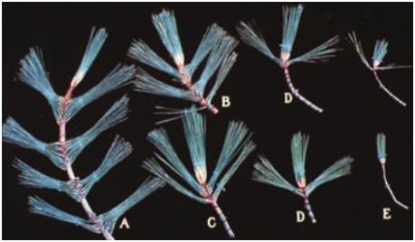 Rysunek 2. Wpływ zanieczyszczeń powietrza na wzrost drzew. Próbki sosny żółtej pochodzące z miejsc o różnym stopniu zanieczyszczenia (A-najczystsze, E–najbardziej zanieczyszczone). Anthony Gomes, źródło.