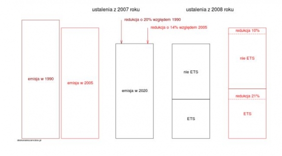 - Pula emisji dla sektorów pozostających poza ETS została rozdzielona uwzględniając specyfikę gospodarek poszczególnych państw Unii. W przypadku Polski, cel redukcyjny sektorów poza ETS jest dodatni i możemy w jego obrębie zwiększyć emisję gazów cieplarnianych o 14% w stosunku do poziomu z 2005.