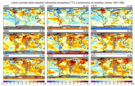 Letnie anomalie (odchylenia od średniej) temperatury. Odchylenia temperatury w miesiącach czerwiec-lipiec-sierpień (lato na półkuli północnej) od średniej z okresu 1951-1980 są pokazane na Rys. 1 Wartości ukazano dla lat z połowy kolejnych dekad (1955, 1965, 1975) i sześciu ostatnich lat.