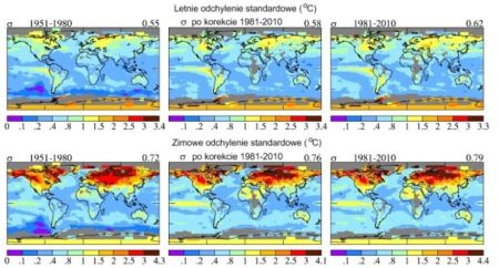 Standardowe odchylenie lokalnych temperatur powierzchni ziemi od średniej w okresie 1951-1980 (Rys. 2, lewa kolumna) jest miarą typowych wahań temperatur pór roku w tym 30-letnim okresie bazowym.