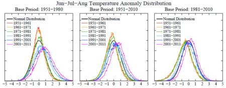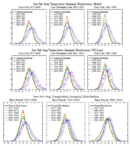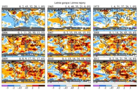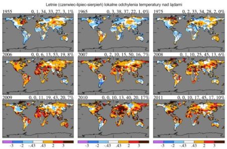 Wyraźnie widać znaczące przesunięcie rozkładu w stronę wyższych temperatur w kolejnych dekadach, w ostatnich 30 latach, przy czym proces ten najwyraźniejszy jest nad lądami (wykresy w dolnym wierszu). Ponadto, w ostatnich dekadach wyraźnie większa się zakres zmienności wskaźników. Występowanie odchyleń temperatury klasy +3σ, +4σ a nawet +5σ, praktycznie nie zdarzających się w okresie 1951-1980, w ostatniej dekadzie stało się wyjątkowo częste, co pokazują duże brązowe obszary na Rys. 3. Szczególnie chłodne okresy letnie zdarzają się zaś znacznie rzadziej. W ostatniej dekadzie (2001-2011) prawdopodobieństwo chłodnego lata (lewa kolumna na Rys. 5) spadło w skali planety do 13%, a dla lądów półkuli północnej do jedynie 8%.