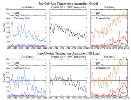 Ponaddziesięciokrotne powiększenie się powierzchni wyjątkowo gorących obszarów (anomalie termiczne > +3σ ) w lecie odzwierciedla przesunięcie się rozkładu temperatury w górę w związku z przyspieszającym przez ostatnie 30 lat globalnym ociepleniem, jak jest to widoczne na Rys. 4. Jednym z następstw tego faktu jest to, że ekstremalne fale upałów, takie jak te z Teksasu w 2011 roku, Moskwy w 2010 roku czy Francji w 2003 roku prawie na pewno nie miałyby miejsca, gdyby nie globalne ocieplenie i związane z nim przesuwanie się rozkładu temperatur. Innymi słowy, możemy z dużym stopniem pewności stwierdzić, że te ekstremalne temperatury są konsekwencjami globalnego ocieplenia.