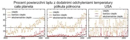 Rys. 7. Procent powierzchni Ziemi (z lewej), lądów półkuli północnej (po środku) i USA (z prawej) z odchyleniami z kategorii „ciepło” (temperatury większe od średniej o 0,43σ), bardzo ciepło (temperatury większe od średniej o 2σ) i ekstremalnie ciepło (temperatury większe od średniej o 3σ).