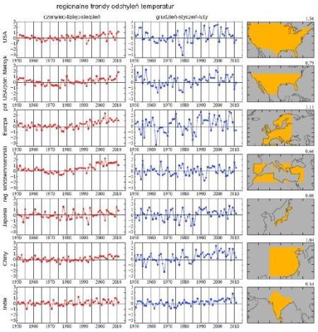 Porównanie zmian temperatur w lecie i zimie dla kilku wybranych regionów jest przedstawione na Rys. 8. Widać, że nawet dla tych niewielkich regionów (maksymalnie 1,5% powierzchni Ziemi), systematyczny wzrost temperatur jest wyraźny, szczególnie w lecie. Jednak na większości terenów wciąż mogą zdarzać się średnie temperatury pór roku niższe od średniej z lat 1951-1980, szczególnie w zimie.