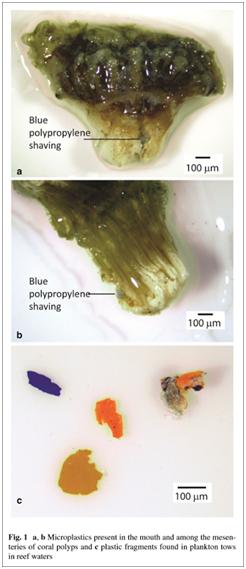 Badający Wielką Rafę Koralową naukowcy z Uniwersytetu Cooka stwierdzili, że koralowce wchłaniają mikro-plastik, cząstki o średnicy mniejszej niż 5 mm, w takim samym tempie co cząstki pożywienia. Plastik znaleziono w tkankach układu pokarmowego.