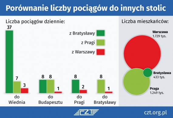 Tymczasem Warszawa dysponuje tylko czterema pociągami do Berlina, trzema do Wiednia, dwoma do Pragi oraz jednym – tylko nocnym – do Bratysławy i Wiednia. Podkreślmy, że w porównaniu z Warszawą większą liczbą pociągów do Berlina dysponuje Bratysława – choć przecież Słowacja nie graniczy z Niemcami. Z Bratysławy do Berlina odjeżdża mianowicie pięć pociągów na dobę.