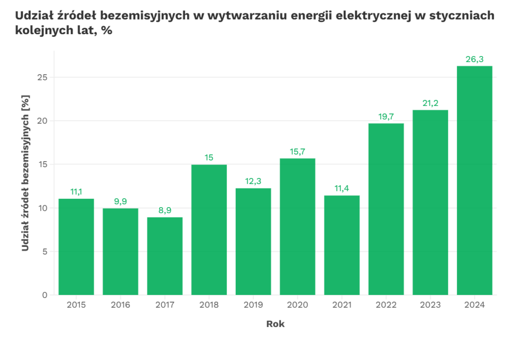 Mimo tylu problemów również i styczeń pokazał, że polski system elektroenergetyczny zmienia się nieodwracalnie. W pierwszym miesiącu 2024 r. ze źródeł bezemisyjnych (wiatr, słońce, woda) pochodziło 26,3% wytworzonej w Polsce energii elektrycznej. Rok temu było to 21,2%.
