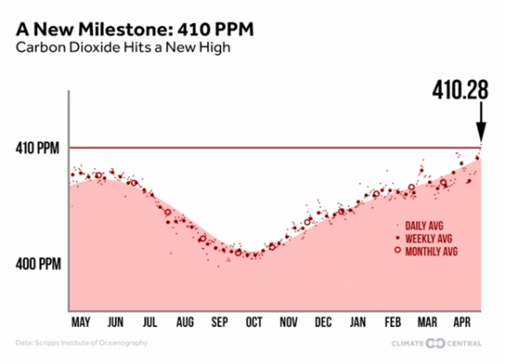 Rysunek 1. Zmiany ilości CO2 z ostatnich 12 miesięcy, mierzone w stacji badawczej Mauna Loa na Hawajach. Grafika: Climate Central