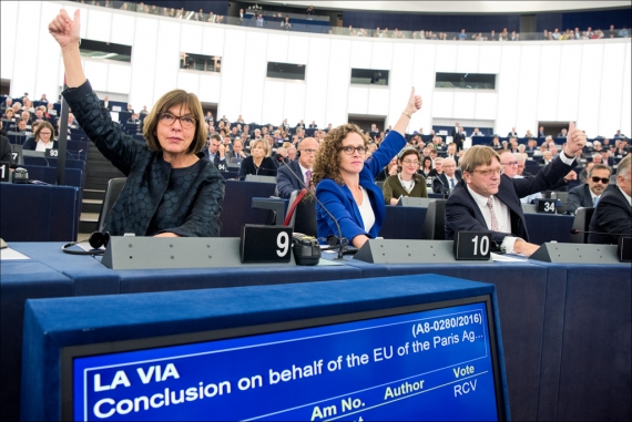 We wtorek 4 października Parlament Europejski przytłaczającą większością głosów (630 do 38, z 31 wstrzymującymi się) ratyfikował porozumienie klimatyczne z Paryża, a 5 października Unia Europejska przekazała dokumenty ratyfikacyjne.