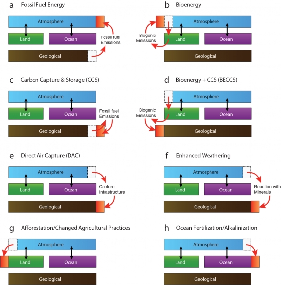 Problem „przepaści emisyjnej” jednak nie zniknął, i od ładnych kilku lat coraz głośniejsze stawały się opinie że celu dwóch stopni nie da się osiągnąć bez masowego użycia NETs, negative emissions technologies, czyli technologii usuwających dwutlenek węgla z atmosfery, albo zwiększających efektywność naturalnych procesów prowadzących do tego samego celu. Schematycznie pokazane są one na rysunku poniżej (d, e, f, g, h)