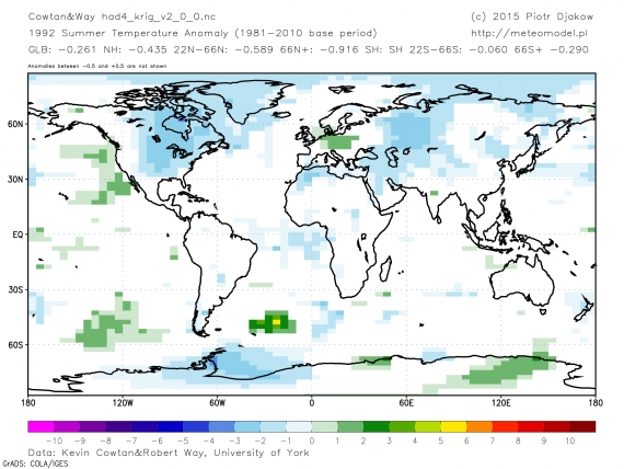 Doskonale sytuację tę prezentuje powyższy wykres, przedstawiający średnie roczne anomalie temperatury w Polsce (odniesione do okresu referencyjnego 1981-2010). Widać na nim, że o ile zmienność międzyroczna jest duża i na przestrzeni kilku lat anomalie roczne mogą się różnić nawet o 3°C. Proszę to teraz odnieść do Globalnego Ocieplenia, które odznacza się tempem rzędu 0.2°C/dekadę. Staje się oczywiste, że międzyroczna temperatura w Polsce odznacza się dużo większą zmiennością, niż trend wynikający z globalnego ocieplenia. Często chłodniejszych od (bieżącej) normy może być nawet parę kolejnych lat. I to właśnie jest nagminnie wykorzystywane przez wspomnianych wyżej komentatorów, którzy słowem nie wspomną, że chłodny skądinąd rok 2010 w Polsce (patrz wykres) w połowie naszego wieku byłby uznany za normalny. Przede wszystkim jednak ekstrapolowanie danych z Polski na cały świat mija się z celem. Dla przykładu: wyjątkowo ciepłe w Polsce lato 1992 (w latach 1781-2017 był tylko jedno cieplejsze) przypadło na okres w którym temperatury globalne były wyjątkowo niskie w związku z mającym miejsce rok wcześniej wybuchem wulkanu Pinatubo. Tak na przykład wyglądało 22 sierpnia 1992 Great Falls w USA (Montana, nie tak dawno temu niektórzy dziwili się tam śniegowi w październiku). Tego dnia spadło tam ponad 21 cm śniegu, wcześniej w czasie 100 lat obserwacji nigdy nie zaobserwowano pokrywy śnieżnej w sierpniu. W Polsce zaś zmierzaliśmy w stronę skrajnie upalnej końcówki sierpnia – w ostatnich dniach tego miesiąca temperatura maksymalna wzrosła miejscami znacznie powyżej 35°C, najpóźniej w historii pomiarów (aż do 2015).