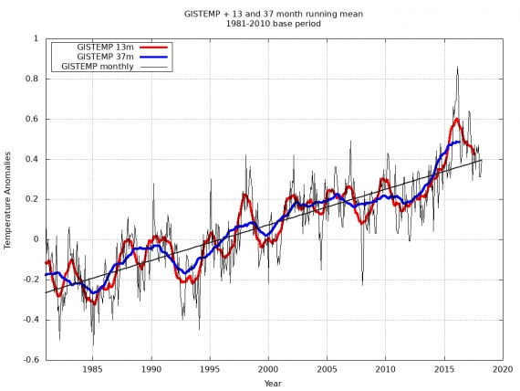 Powyższy wykres przedstawia przebieg miesięcznych anomalii temperatury globalnej od 1981 r. wraz z 13. i 37. miesięczną średnią ruchomą. Od roku 2015 temperatury globalne przyjęły wartości rekordowo wysokie, czemu poza Globalnym Ociepleniem pomogła dodatnia faza ENSO: El Niño. Od tego czasu temperatury globalne spadły (co związane jest z nieco rachityczną ujemną fazą ENSO – La Niña). Pomimo wszystko, mimo braku El Niño, mimo obecności słabej La Niña, temperatury globalne spadły jedynie do poziomu najwyższych wartości, jakie występowały przed 2015. To oznacza, że obecny globalny “chłód” odznacza się takimi samymi wartościami temperatury (globalnej), jak “wyjątkowe ciepło” przed 2015. Znacznie silniejsza La Niña najprawdopodobniej sprowadziłaby te anomalie do niższego poziomu, jednakże nadal znacznie wyższego, niż w czasie silnych La Niña przed 2015.