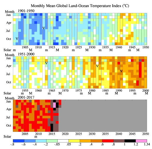 Na powyższym wykresie (źródło: http://www.columbia.edu/~mhs119/Temperature/T_moreFigs/ za NASA/GISS) mocno rzucają się w oczy pierwsze w historii pomiarów instrumentalnych przekroczenia wartości globalnej temperatury rzędu 1.0, a nawet 1.2°C powyżej normy z lat 1951-1980. Od 2001 r. wartości, które w latach przed 1995 określilibyśmy jako “bardzo wysokie”, stały się nagle wartościami niskimi. Warto również rozważyć liczbę miesięcy z anomalią wyższą od 0.8°C przed i po roku 2015.