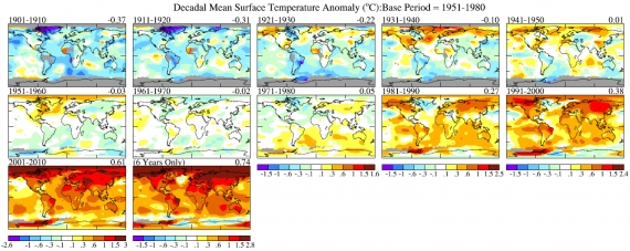 Powyższe mapy (źródło jak wyżej) przedstawiają rozkład anomalii temperatury w kolejnych dekadach. Wyjątkowość lat po 2001 rzuca się tu w oczy aż nadto.