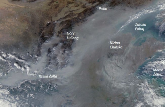 Zdjęcie satelitarne Chin wykonane przez satelitę Aqua 28.10.2009– smog wisi nad całym krajem, w wielu miastach przez wiele dni nie widać Słońca, alarmy smogowe spowodowane chińskim smogiem ogłaszane są aż w Japonii. Źródło NASA.