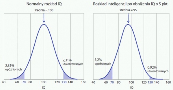 Porównanie normalnego rozkładu IQ w populacji oraz populacji, w której IQ jest obniżone o 5 punktów. Obniżenie IQ o 5 punktów, ze średniej 100 do 95 – co wydawałoby się niewielką zmianą – spowoduje wzrost ilości osób upośledzonych o blisko 40%, a także spadek osób szczególnie utalentowanych o ponad 60%. Źródło.