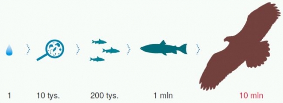 Kumulowanie się związków organicznych na kolejnych ogniwach łańcucha pokarmowego na przykładzie DDT. Fitoplankton filtruje wodę, następnie jest zjadany przez plankton zwierzęcy – koncentracja związku chemicznego jest już 10 tysięcy razy wyższa niż w wodzie. Małe rybki zjadają zooplankton, również gromadząc w sobie związek chemiczny – jego stężenie jest już 200 tysięcy razy wyższe niż w wodzie. Duże ryby zjadają małe – koncentracja rośnie do 1 miliona. Na koniec zwierzę ze szczytu łańcucha pokarmowego zjada dużą rybę, kumulując w sobie w ten sposób rekordowo wysokie stężenie związku chemicznego – tutaj 10 milionów razy wyższe od jego stężenia w wodzie. Na podstawie „The Silent Spring”, Rachel Carson