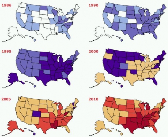 Trendy otyłości w USA w okresie 1986-2010. Diagram pokazuje odsetek osób otyłych (BMI>30) w poszczególnych stanach. Współczynnik BMI (Body Mass Index) jest definiowany jako waga ciała (wyrażona w kilogramach) podzielona przez kwadrat wzrostu (wyrażony w metrach). Jakie jest Twoje BMI? Źródło: Centers for Disease Control and Prevention.
