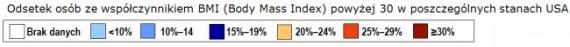 Stopień otyłości jest mierzony za pomocą wskaźnika BMI (Body Mass Index), który jest definiowany jako waga ciała (wyrażona w kilogramach) podzielona przez kwadrat wzrostu (wyrażony w metrach). Odsetek ludzi o BMI>30, czyli osób otyłych rośnie z roku na rok. Jeszcze 20 lat temu w żadnym ze stanów USA odsetek ten nie przekraczał 14%. Dziesięć lat temu warunek ten spełniał jedynie stan Kolorado, a w połowie stanów odsetek otyłych osób sięgnął 20-24% (w żadnym jednak nie przekroczył tego poziomu). W 2009 roku odsetek osób otyłych w aż dziewięciu stanach przekroczył 30%29.