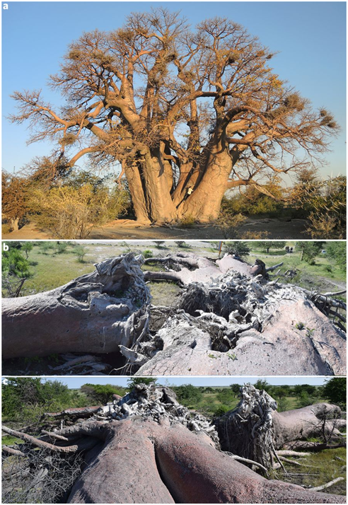 Ilustracja 2. Baobab Chapmana w Botswanie, składający się z 6 pni. Na górze w 2015 roku, po środku i na dole po nagłym rozpadzie w styczniu 2016 roku. Patrut i in., 2018.