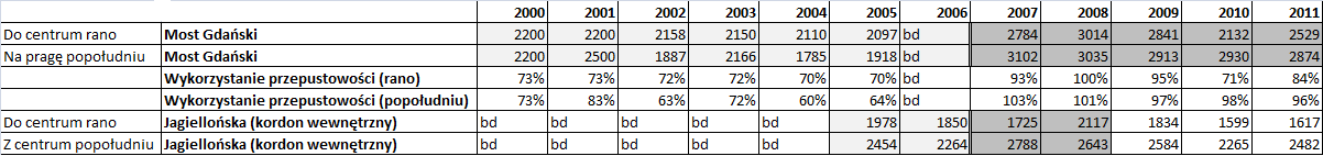 Tabela 1 Liczba (kliknij, aby powiększyć) pojazdów na godzinę dla mostu Gdańskiego i Jagiellońskiej wg pomiarów ZDM.