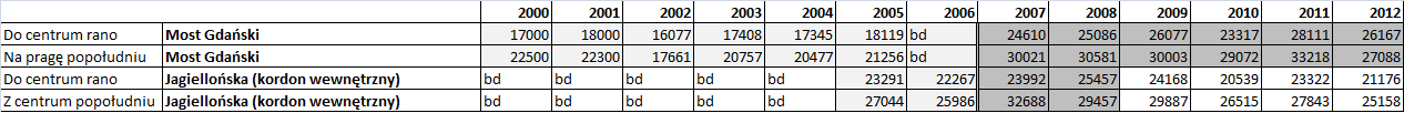 Tabela 2 Liczba (kliknij, aby powiększyć) pojazdów na dobę dla mostu Gdańskiego i Jagiellońskiej wg pomiarów ZDM.