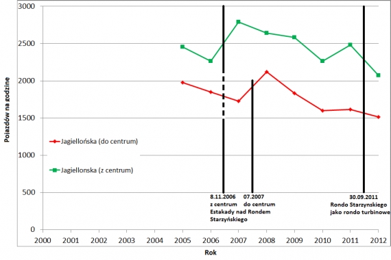 Trwałych efektów udrożnienia ronda nie obserwujemy jednak na ulicy Jagiellońskiej, co pokazuje wykres 3. Na kierunku z centrum miasta, dla którego estakady oddano wcześniej w szczycie popołudniowym ruch drogowy wzrósł bezpośrednio po oddaniu estakad do ruchu. W latach 2005-2006 wynosił średnio ok. 2350 pojazdów na godzinę, a w latach 2007-2008 ok. 2700 pojazdów na godzinę, czyli o ok. 350 pojazdów więcej (15%). Jednak w kolejnych latach 2009-2011 ruch drogowy w szczycie popołudniowym z centrum wrócił do poziomu ok. 2450 pojazdów na godzinę. Na kierunku do centrum miasta, dla którego estakadę oddano później w latach 2006-2007 średni ruch drogowy był nieco niższy niż w latach 2008-2009. Bez estakad ruch ten wynosił ok. 1800 pojazdów na godzinę, a po ich wybudowaniu wynosił ok. 1980 pojazdów na godzinę, czyli o ok. 180 pojazdów więcej (10%). Po 2009 roku jednak ruch ten spadł do poprzednich wartości. Po 2008 roku na ulicy Jagiellońskiej w obydwu kierunkach trend natężenia ruchu był spadkowy na co tylko niewielki wpływ miała zmiana organizacji ruchu na rondzie Starzyńskiego w 2011 roku na rondo turbinowe. Brak zmian na ulicy Jagiellońskiej pokazuje, że budowa estakad w relacji wschód-zachód nie odciążyła pozostałych relacji na rondzie, nie dając dla nich prawie żadnych zysków w zakresie przepustowości w godzinach szczytu.