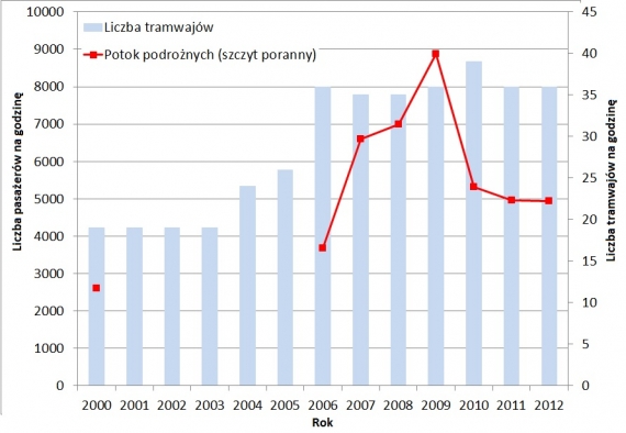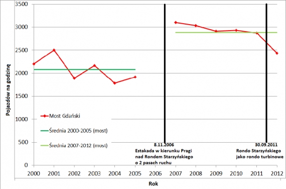 W praktyce od roku 2000 do roku 2012 liczba pasażerów w tramwajach na Moście Gdańskim w godzinach szczytu porannego do centrum zmieniała się tak, jak uwidoczniono w tabeli 3 i na wykresie 3 . Z tego zestawienia wynika, że tylko tramwaje jeżdżące przez Most Gdański przyjęły znacznie większą liczbę osób, nawet dodatkowe 5000, niż dodatkowa ilość przewieziona przez estakady nad Rondem Starzyńskiego po 2007 roku. Oczywiście należy pamiętać, że główną przyczyną wzrostu liczby pasażerów tramwajów na moście Gdańskim w latach 2007-2009 był remont mostu Śląsko-Dąbrowskiego. Jednak różnica w liczbie pasażerów tramwajów pomiędzy pomiarami w roku 2006 (przed remontem mostu Śląsko-Dąbrowskiego) i 2012 (po remoncie mostu Śląsko-Dąbrowskiego) wynosi ok. 1300 osób, co także potwierdza poniższy wniosek. W tym przypadku to tramwaje, bez budowy nowej infrastruktury, mają znacznie większy potencjał do przewiezienia dodatkowych osób zmierzających do centrum, niż zbudowane w 2006 i 2007 roku estakady nad Rondem Starzyńskiego.