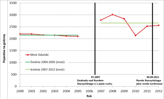 Jak widać już w 2007 roku ruch drogowy w porannym szczycie do centrum przejeżdżający przez Most Gdański, a więc na kierunku, na którym nastąpiło zwiększenie przepustowości skrzyżowania, wynosi 2784 pojazdy na godzinę i jest większy od odnotowanego przed przebudową w 2005 roku ruchu o takiej samej porze dnia, kiedy to wynosił 2097 pojazdów na godzinę. W kolejnych latach ruch ten już nie wykazywał tendencji wzrostowej. Różnica pomiędzy średnim natężeniem ruchu drogowego na Moście Gdańskim dla lat 2000-2005 przed przebudową i średnim natężeniem dla lat 2007-2012 po przebudowie wynosi prawie dokładnie 500 pojazdów więcej (23%) w godzinie szczytu porannego do centrum, co można uznać za maksimum dodatkowej przepustowości północnej estakady Ronda Starzyńskiego. Pomiędzy tymi samymi okresami ruch dobowy w kierunku zachodnim wzrósł o ponad 8000 pojazdów (47%).