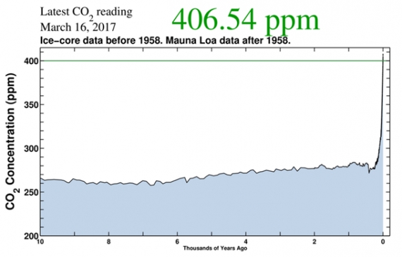Mierzone przez NOAA w obserwatorium na Mauna Loa stężenie CO2 w 2016 roku wzrosło o 3 cząsteczki na milion cząsteczek powietrza (ppm), podobnie jak rok wcześniej. Są to rekordowo wysokie wzrosty, bezprecedensowe w 59-letniej historii pomiarów. To już piąty rok z rzędu, kiedy stężenie CO2 rośnie o ponad 2 ppm.