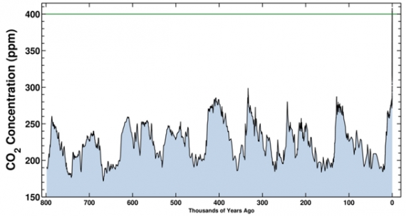 Rysunek 3. Zmiany stężenia dwutlenku węgla w ciągu ostatnich 800000 lat. Dane do 1958 roku z rdzeni lodowych, po 1958 roku pomiary na Mauna Loa. Źródło