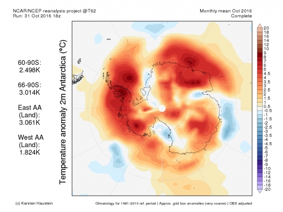 Rysunek 3. Średnie dla października 2016 odchylenia temperatur od średniej 1981-2010 na Antarktydzie. NOAA/NCAR, Karstenhaustein