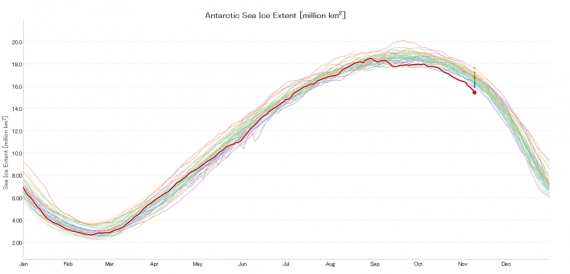 Rekordowo niski zasięg lodu w Arktyce oraz najmniejszy w historii pomiarów zasięg lodu na Antarktydzie, przełożył się na globalny rekord. Odchylenie sięga zawrotnych 4 mln km2. Normalnie w listopadzie mamy maksimum globalnego zasięgu lodu pływającego. W tym roku to maksimum praktycznie znikło! Zasięg jest aż o 2 mln km2 mniejszy niż w dotychczas rekordowym 2012 roku!