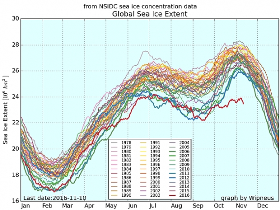 Rysunek 4. Globalny zasięg lodu morskiego w 2016 w stosunku do lat poprzednich. Dane NSIDC, wykres Wipneus