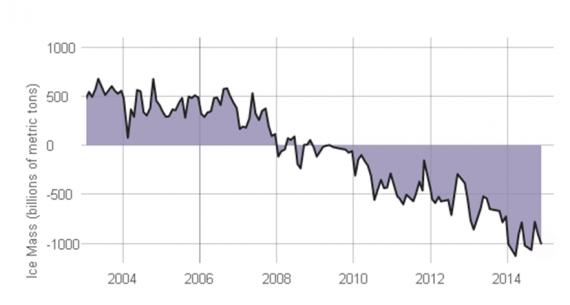 Rysunek 6. Oszacowanie zmiany masy lądolodu Antarktydy od 2003 roku na podstawie pomiarów grawimetrycznych NASA GRACE. Zero oznacza średnią z okresu 2002-2014.