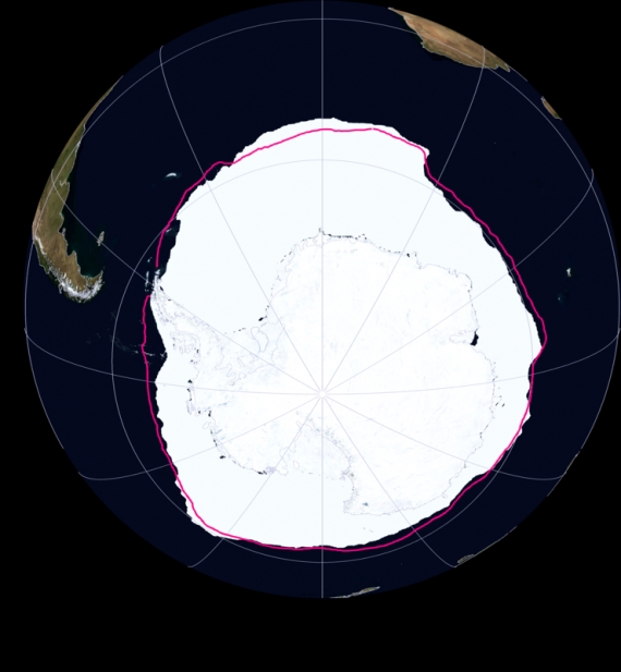 Rysunek 1. Zasięg lodu morskiego wokół Antarktydy, czerwona linia pokazuje zasięg w 2016 roku. Arctic Data Archive System/Jaxa