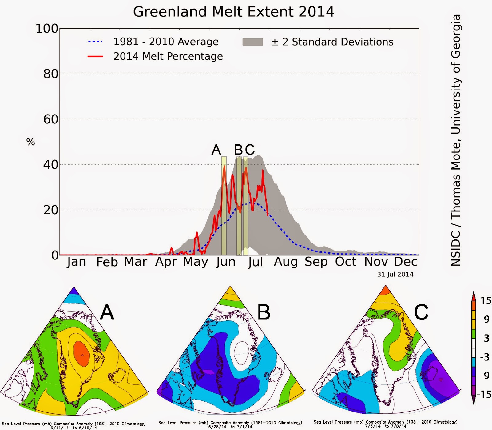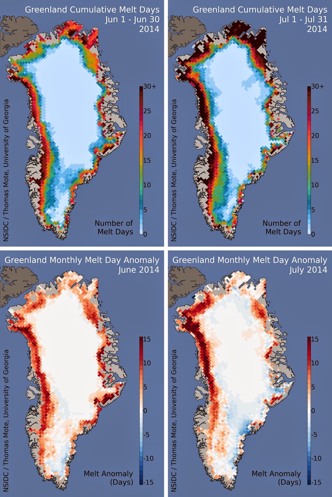 Ogólny bilans topnienia śniegu na powierzchni grenlandzkiego lądolodu w tym roku jest zbliżony do średniej. O ile jesienne opady śniegu w 2013 roku były lekko powyżej średniej, to letnie topnienie w 2014 roku zredukowało nadwyżkę śniegu zakumulowaną po zimie 2013/2014. Duże straty w pokrywie śnieżnej z powodu niskich opadów śniegu zimą, wystąpiły w północno zachodniej części wyspy. Stąd właśnie dość znaczny ubytek w lodzie, jaki miał miejsce w lipcu, w tejże części Grenlandii.