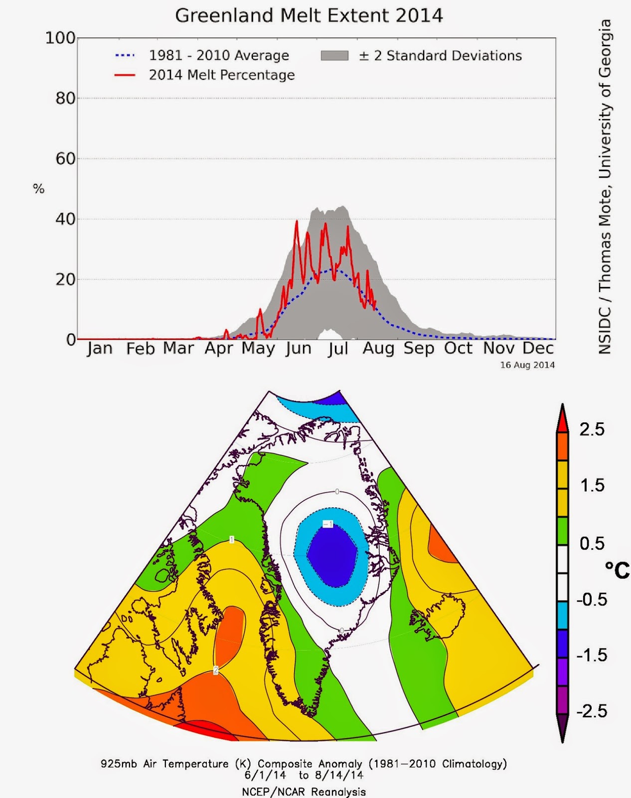 13 czerwca 2014 roku, to dzień, kiedy blisko 40% powierzchni grenlandzkiego lądolodu topiło się. Był pierwszy z czterech ciepłych okresów, kiedy to topnienie miało tak dużą skalę. Wraz z nastaniem sierpnia skala topnienia tradycyjnie ulegała zmniejszaniu. Potem doszło kolejnego, nieoczekiwanego skoku. Między 16 a 22 sierpnia, w związku z silnym napływem ciepła znad półwyspu Labrador i Morza Labradorskiego, topnienie objęło prawie jedną trzecią lądolodu. Następnie proces topnienia gwałtownie spadł, i na Grenlandii temperatury szybko się obniżyły.