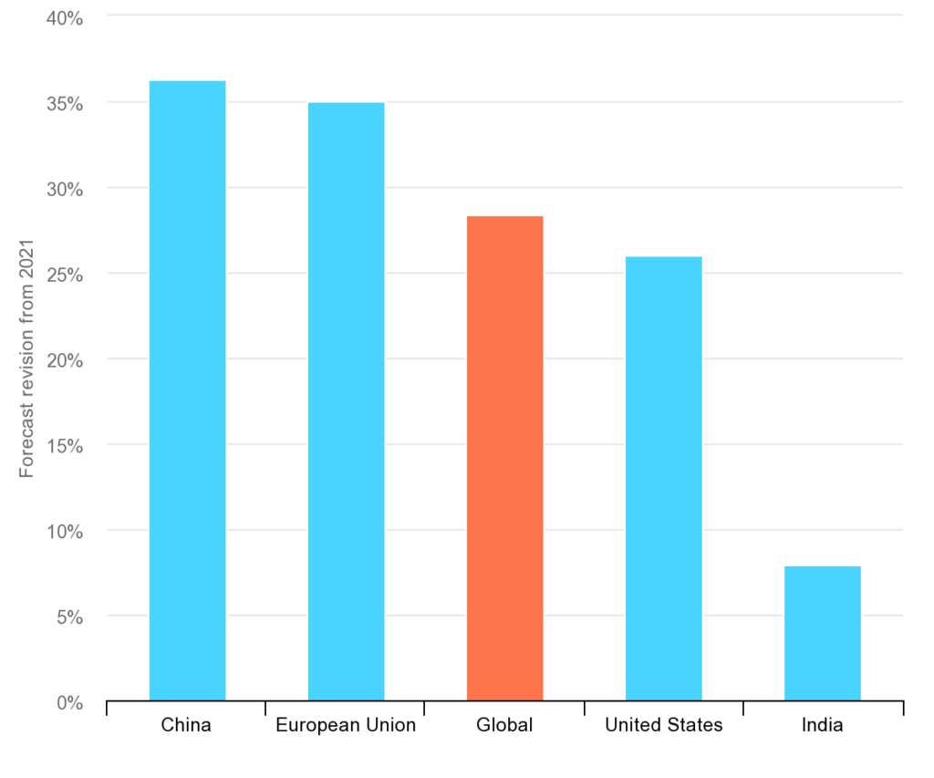 Procent, o który zwiększono prognozę wzrostu mocy OZE. Na kolejnych słupkach widać Chiny, Unię Europejską, świat, USA i Indie. [Źródło: MAE; Licencja: CC BY 4.0]