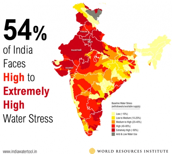 Rys. 2 Mapa pokazująca poziom stresu wodnego w Indiach. 54 % powierzchni kraju znajduje się w stanie ekstremalnie wysokiego stresu wodnego.