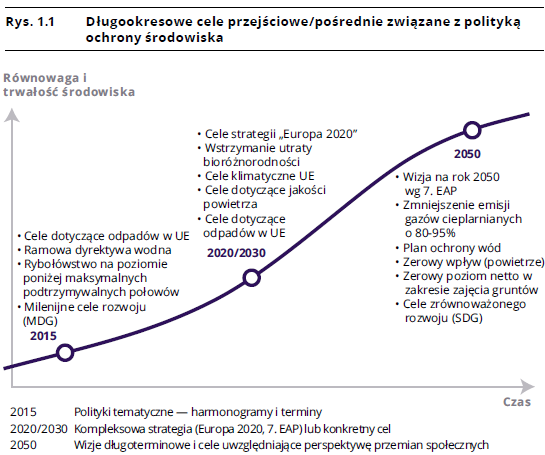 Te różne skale czasowe stanowią kolejne wyzwanie, ponieważ osiągnięcie długoterminowych celów i realizacja długoterminowej wizji zależy zasadniczo od działań i inwestycji krótko- i średnioterminowych. UE musi zapewnić, że cele jej polityki na lata 2020–2030 stworzą realne podstawy budowania wizji na rok 2050 (zob. rys. 1.1). Niedawno przyjęty 7. program działań w zakresie środowiska zapewnia spójne, systemowe ramy dla zwiększania wysiłków społeczeństwa na rzecz osiągnięcia tych celów. Zobowiązuje UE do „pobudzania przejścia na zieloną gospodarkę i dążenia do absolutnego oddzielenia wzrostu gospodarczego od degradacji środowiska”, zaś wizja na rok 2050 ma „pomóc w wyznaczaniu kierunku działań do 2020 r. i później”.