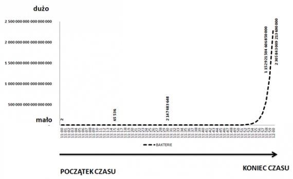 Dlaczego tak się stało? Oto krótka historia na jednym rysunku (zwróćcie uwagę na godzinę i na te zwariowane liczby! U góry mamy ilość bakterii, a na dole godzinę):