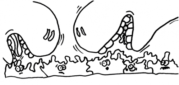Jak widzicie, na samym początku było dużo jedzenia i miejsca, ale niestety jego ilość była ograniczona do wielkości szalki. Z kolei bakterie były tylko dwie (i szalka wydaje się być pusta, ale tak naprawdę tam jest tyle bakterii, bo jak już pisaliśmy – są po prostu bardzo malutkie). Potem bakterie zaczęły się mnożyć jak szalone, a każda z nich jadła (czyli KONSUMOWAŁA) tyle samo. I wtedy jedzenia i miejsca było coraz mniej i mniej, aż w końcu go zabrakło. Im więcej było bakterii, tym mniej było jedzenia. Wyobraź sobie, że z kolegą dostaliście tabliczkę czekolady i obiecaliście sobie, że każdy z Was będzie jadł po jednej cząstce na każdej przerwie. Dzięki temu wystarczy jej na cały dzień. Ale na trzeciej przerwie przyszło jeszcze kilku innych kolegów i każdy też zjadł po jednej cząstce, bo przecież niby czemu nie. Nikt dużo nie zjadł, ale czekolada szybko zniknęła i już jej nie było. Możesz to nazwać KRYZYSEM, bo kryzys jest wtedy, gdy dość długo sytuacja jest w miarę okej, a potem nagle następuje katastrofa. Bakteriom wydawało się, że wylądowały niczym pączek w maśle, aż tu nagle właśnie nastąpił kryzys. Miały dużo jedzenia i nie myślały o tym, że go kiedykolwiek zabraknie. Dodatkowo Szalony Naukowiec Marian nie zamierzał w ramach zemsty nic nowego dorzucić bakteriom do jedzenia… Zatem bakterie po prostu po kolei zdechły z głodu i toksyn, które wytworzyły.