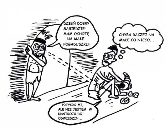 Taki człowiek z wyspy nigdy nie mógł być pewien, czy sąsiad wpada do niego na pogaduchy o pogodzie, czy może ma ochotę na jego soczystą łydkę. A ponieważ nie było telefonów ani emaili, to nie mogli się umówić wcześniej co do celu wizyty.