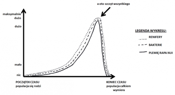 Wszystkie trzy populacje, które są na wykresie, znajdowały się w środowisku, w którym początkowo dostępne zasoby mogły zostać wyczerpane, a dodatkowo nie można było liczyć na dostawy z zewnątrz. Krótko mówiąc: bakterie i renifery żarły i żarły to, co miały aż zdechły. Ludzie nie tylko żarli, ale zużywali zasoby środowiska (czyli głównie palmy) aż prawie wymarli. Proste. Można to również opisać w czterech punktach, weźmy na przykład bakterie: