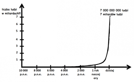 Siedzieli w jaskiniach, nie byli zbyt inteligentni, polowali na dzikie zwierzęta, one polowały na nich. Człowiek wtedy był jeszcze dosyć słabym gatunkiem. Potem działo się dużo różnych innych rzeczy, ale – co najważniejsze – ludzie uczyli się, jak wykorzystywać to, co mają na ziemi, w celu poprawienia swojej sytuacji. Ta linia, która na początku jest tak płaska, że prawie jej nie widać, mogłaby sobie być płaska dalej lub rosnąć bardzo powoli, gdyby nie kilka superważnych odkryć, które popchnęły ludzkość naprzód. Dzięki temu ludzie zyskali narzędzia, które pozwoliły im stawać się bogatszymi i w związku z tym Dorośli mogli sobie pozwalać na posiadanie więcej dzieci.