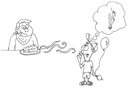 No, a skoro tak, to jeszcze można dorysować sobie tę przerywaną linię, o której wcześniej pisaliśmy. Dorośli dorysowują jeszcze jedną prostą linię po boku (zazwyczaj po lewej stronie), żeby pokazać ile czego było (bo to, że dzieci wiedzą, że czegoś jest dużo lub mało, w świecie dorosłych wcale nie jest takie jasne. I dla jednych dorosłych to, co jest uważane za „mało”, może być uznane przez innych dorosłych za „dużo”). No i skoro umówili się, że linia przerywana to bakterie, to nie będą mieli rysunków.
